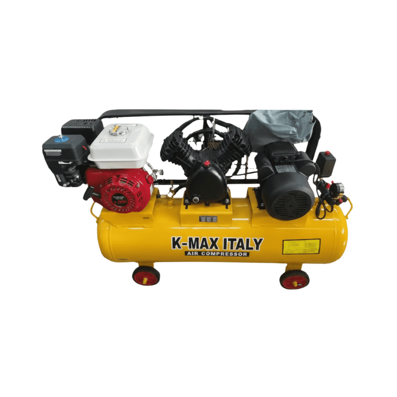 The 100L 3HP K-MAX Italy Two-in-One Air Compressor is a versatile and powerful air compressor designed to meet the needs of a variety of pneumatic applications. With a 100-litre tank, a 3HP motor, and an additional 7.5HP engine, this air compressor provides exceptional air delivery and efficiency. Its maximum pressure of 8 bar (116 psi) makes it ideal for powering pneumatic tools, inflating tires, and other demanding tasks. Whether you’re working in a workshop, garage, or on DIY projects, this air compressor is designed to deliver consistent, reliable performance with ease.